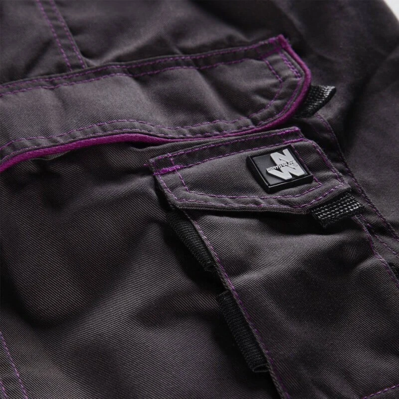 Pour un look moderne et féminin les côtés, les épaules et l’intérieur du col de la combinaison de travail femme Alice sont de couleur noir pour contraster avec le gris et réhaussés d’un liseret violet et d’une surpiqûre de même couleur.