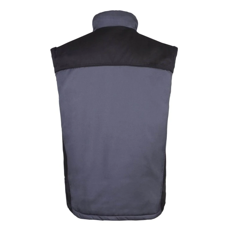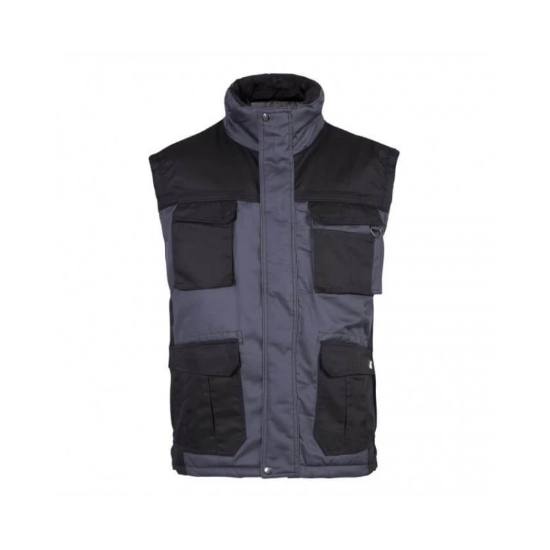 2 poches plaquées devant avec rabats 2 poches repose mains 2 poches poitrine et 1 poche smartphone 1 double poche poitrine avec rabat et zip 1 poche stylo, 1 porte clefs anneau métal 1 poche intérieur Bas de gilet élastiques aux côtés et dos protège reins Coloris : Gris/Noir Taille du S au 4XL Le gilet sans manches Piattec est assorti avec le pantalon de travail peintre Antras NWComposition : 65% polyester 35% coton 245g/m² doublure filet.