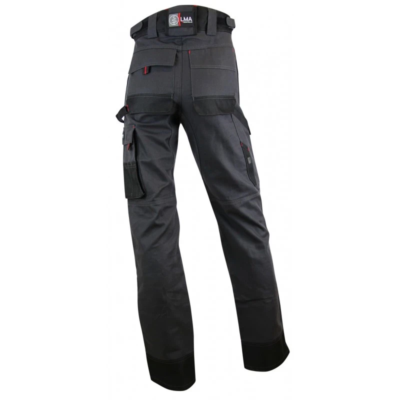 Renforcement entrejambe triples piqûres pour plus de solidité Ceinture resserrable par pattes élastiquées Normes EN13688 vêtements de protection Normes EN14404 Protections des genoux (si utilisation avec des genouillères) Taille du 38 au 54 Coloris : Gris/Noir Composition : 60% coton 40% polyester 300g/m² empiècement oxford 900D 100% polyester 245g/m² Pantalon de travail multipoches modèle 1261 Argile de marque LMA