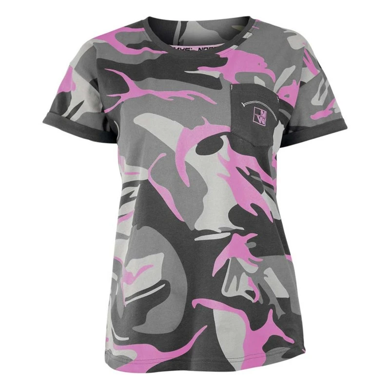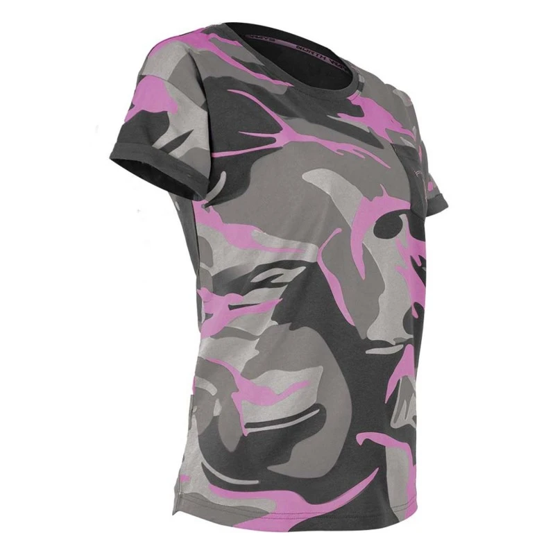Donnez de la couleur à votre tenue de travail avec ce tee-shirt de travail femme avec motif camouflage noir fuchsia ou marine jaune