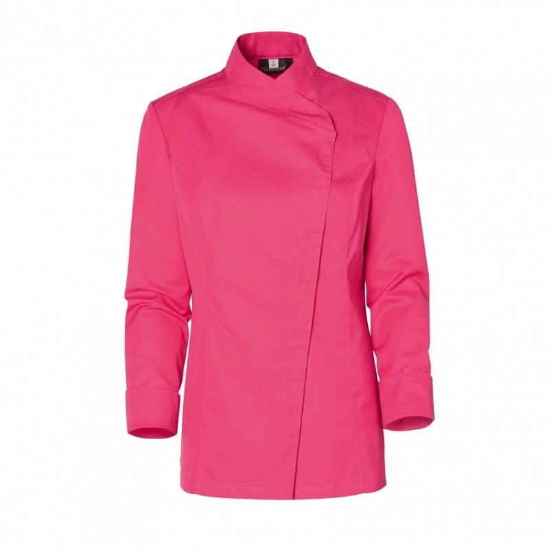 Laissez vous tenter par cette veste de cuisine avec une coupe féminine ajustée un col kimono et une ouverture asymétrique.